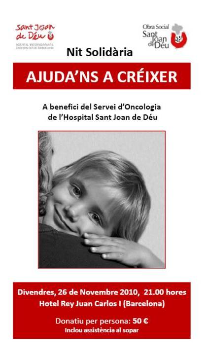 Amb l'objectiu de donar a conèixer la feina que es porta a terme al Servei d'Oncologia de l'Hospital Sant Joan de Déu i d'ajudar a reunir fons per finançar la recerca que es realitza al Laboratori d'Investigació del Càncer del Desenvolupament d'aquest mateix centre, s'organitza el proper divendres 26 de novembre a partir de les 21h a l'Hotel Rey Juan Carlos I, la primera nit solidària "Ajuda'ns a Créixer".